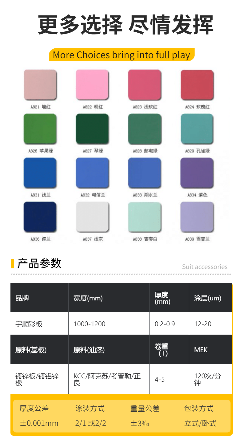 彩涂板具有輕質(zhì)、美觀和良好的防腐蝕性能,又可直接加工,它給建筑業(yè)、造船業(yè)、車輛制造業(yè)、家具行業(yè)、電氣行業(yè) 等提 供了一種新型原材料,起到了以鋼代木、高效施工、節(jié)約能源、防止污染等良好效果。